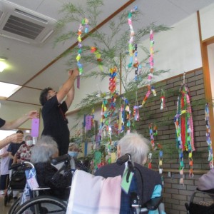 こんにちは。カントリーハーベスト北本です。 本日は、各ユニットでお一人お一人に願い事を 書いて頂いた後、玄関入口部分にある竹に、 短冊を付けました。 高所への取り付けは、こうしてスタッフが行いました。 この後、全員で記念写真を撮影しました。 見学…