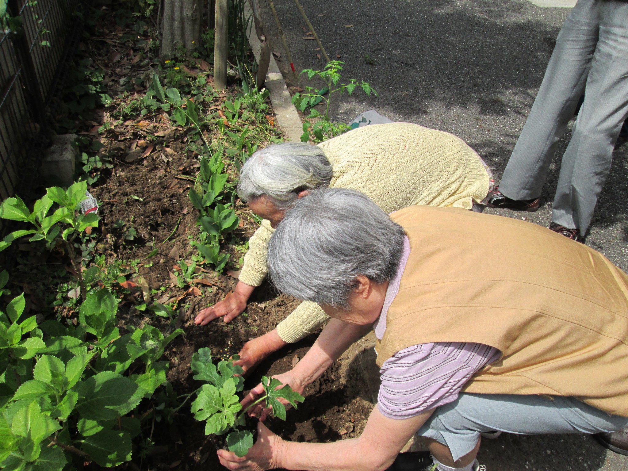 デイのお庭にご利用者様に手伝ってもらい、そら豆とスイカとトマトの苗を植えました。