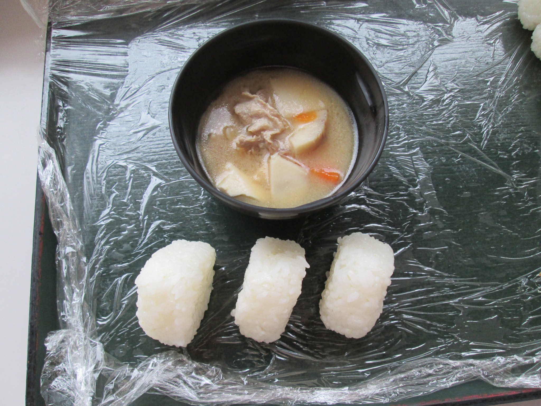 収穫したお米はわずかでしたので、農家さんに依頼したお米を追加しておにぎりをつくりました。おにぎりのお供に豚汁を添えて・・・
