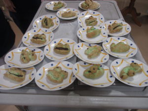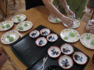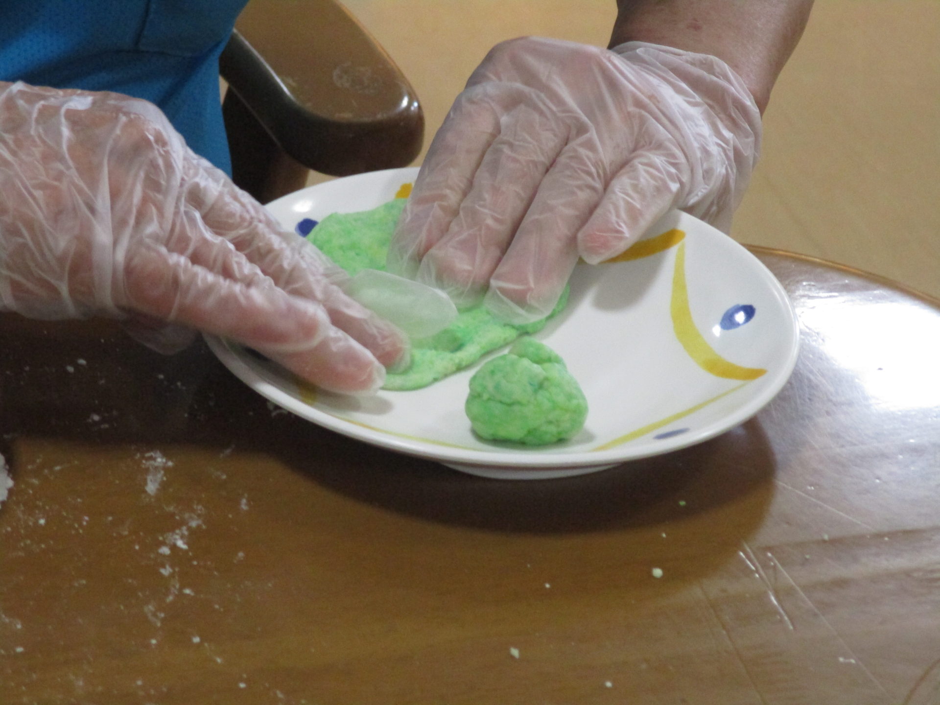 皆さんに、手袋を着用して頂いた後、手作りでおやつ作りを